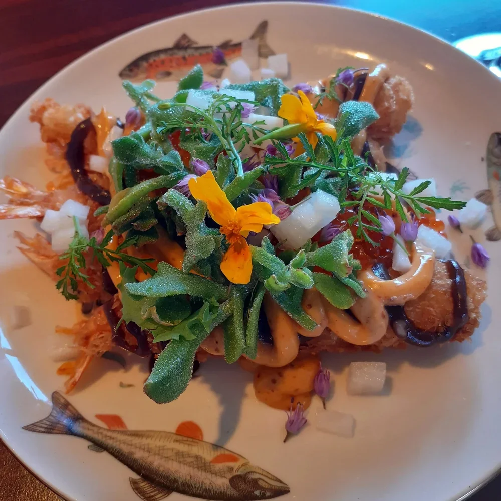 Lækker! Panko-panerede rejer med paprika-mayonnaise, miso-dressing og isurt. Vores tip til en forret i Langø Grill & Fiskebar.